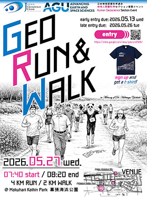 GEORUN&WALK 2026 Time:7:40~8:20 Place: Makuhari Kaihin (Seaside) Park G-Block Into the Core – Live at JpGU–AGU 2026 Time:15:30–17:00 Place: Exhibition Hall Special Setting 3 Award Ceremony Time:17:15~ Place: Stage Area Banquet Time:19:15~ Place: Hotel the Manhattan / Primavera |