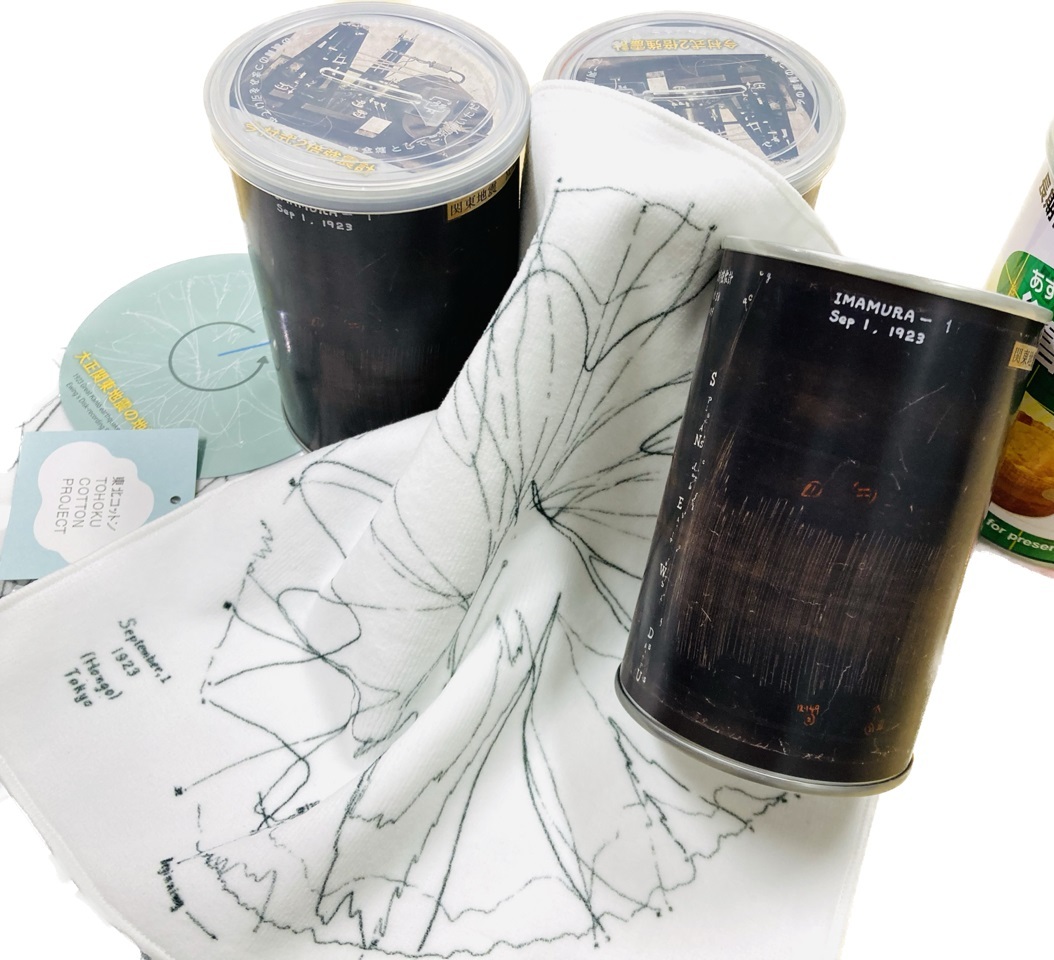 1923関東地震波形缶パン 今村式2倍強震計で録れた記録をあしらった3年間保存がきく備蓄用食パンの缶詰です。今村式2倍強震計はドラム缶にアート紙を巻きつけ石油ランプから出る煤をまんべんなく付着させた記録媒体を使用した機械式地震計です。同じ形状の缶詰をお手に取って頂きながらドラムが自転し地震の揺れを刻みつける様をイメージして頂ければと思います。 1923関東地震波形ハンカチ ユーイングの円盤記録式地震計で録れた大正関東地震の波形を東北コットンを使用したハンカチにあしらいました。元の記録は普段保管庫に所蔵され保存の為、めったにお見せ出来ないのでハンカチにしお手に取って頂ける様にいたしました。
