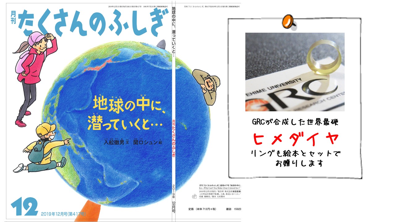 5 名様入舩GRC前センター長と絵本作家の関口シュン氏による絵本「地球の中に潜っていくと・・・」と、GRCで合成した世界最高硬度のナノ多結晶ダイヤモンド(=ヒメダイヤ)リングのセットお贈りします.絵本には,当選された方のご希望で,入舩前センター長の直筆で著者サインとお贈り先を記します.